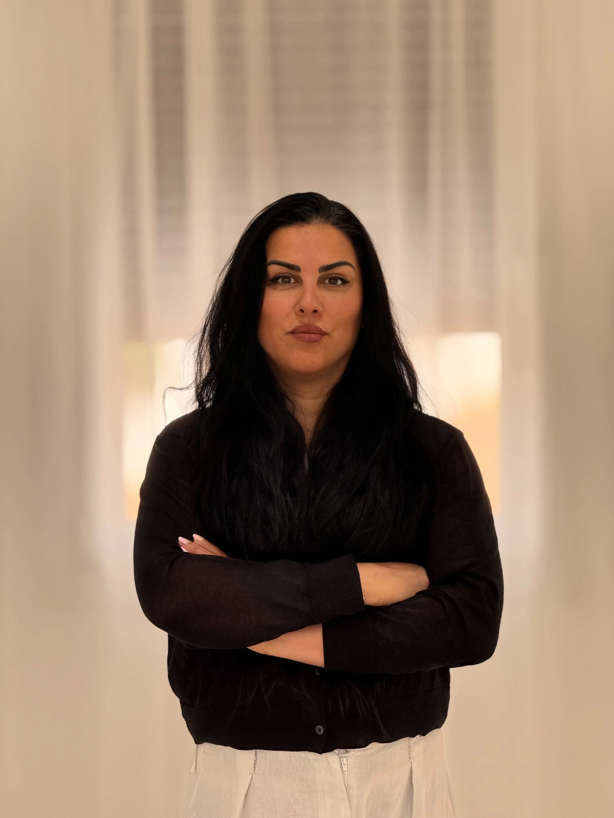 Woman with long black hair, wearing a black blazer and white pants, standing indoors with wooden decor and plants in the background.